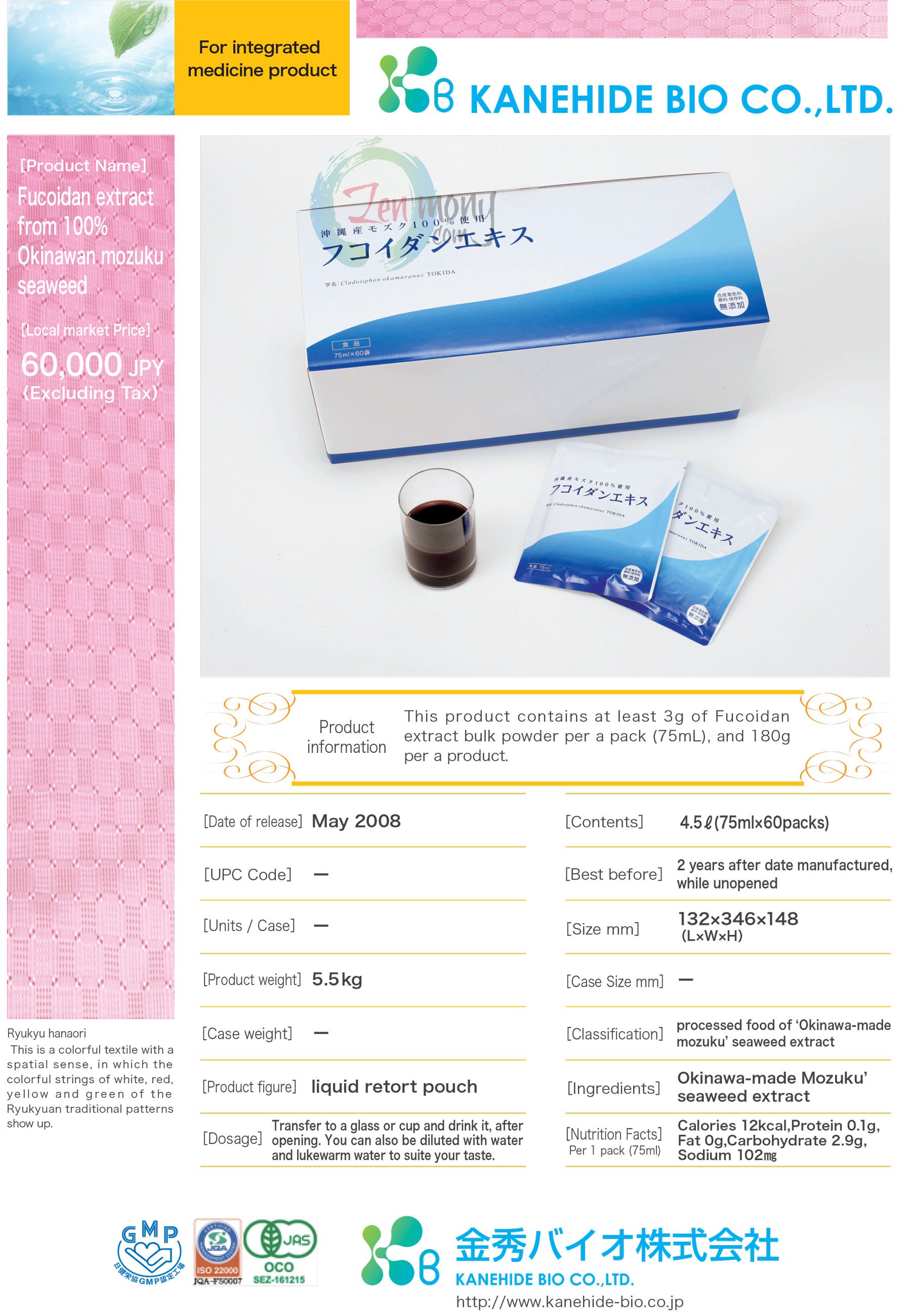 它是來自沖繩的重磅產品!每75毫升中就含有3公克提取自海蘊的褐藻素精華。 沖繩海蘊(學名: 岡村枝管藻)同時含有海蘊褐藻素與U-褐藻素。本產品每盒中包含180公克褐藻素(3g*60支),濃度為目前世界之最。在日本售價不低於63000日元,而Zenmony.com現在提供特別價格,一盒僅需56260日元(約合680美元),以合理的價格提供最高質量褐藻素補給!金秀生物科技有限公司採取獨特的檸檬酸萃取技術,環保的同時也更加健康。用於萃取的檸檬酸,同樣提取自有機檸檬,給您的健康以最值得信賴的保證。褐藻素的發現與利用已有近百年曆史,研究資料一致認為,褐藻素對於抗腫瘤有奇效而無毒副作用。